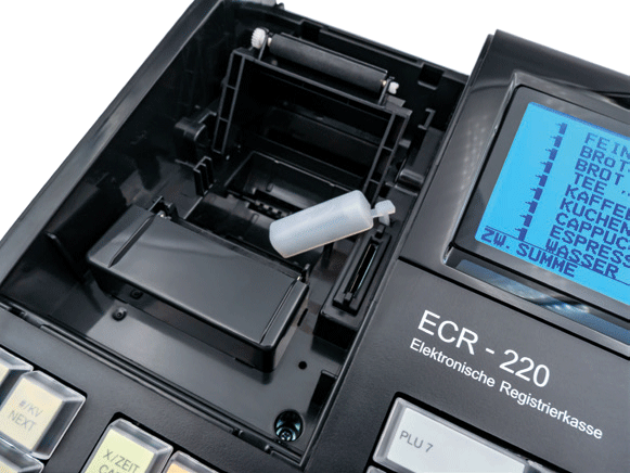 Zur Programmierung, Datensicherung und Erfüllung der gesetzlichen Auflagen in Bezug auf die Verkaufsdatenspeicherung verfügt die ECR-220 über einen SD-Kartenslot, der vor unberechtigtem Zugriff geschützt positioniert ist. Die gesetzlichen Vorgaben werden mit diesem Modell vollumfänglich erfüllt.